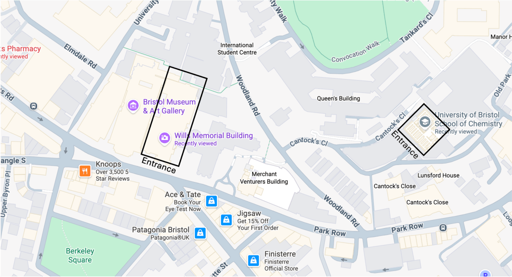 The main conference will be held in the School of Chemistry, University of Bristol. Enter through main entrance off of Cantock’s Close. Registration, posters, catering and exhibitors will be in the main foyer.